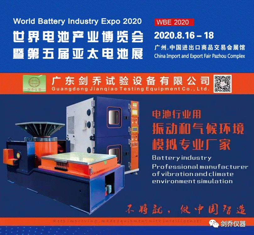 2020年8月16-18日,廣東劍喬試驗設備有限公司【劍喬儀器】將攜旗下最新試驗設備亮相2020世界電池產業博覽會暨第五屆亞太電池展,現場展示:振動試驗系統、溫濕度振動三綜合箱、高加速沖擊試驗臺、恒溫恒濕試驗箱、冷熱沖擊試驗箱等試驗設備及鋰電池相關試驗解決方案。